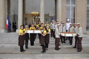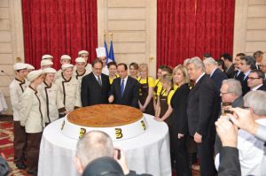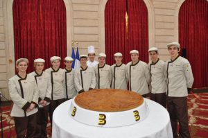 Mardi 8 janvier 2013, le Président de la Confédération Nationale de la Boulangerie Pâtisserie, Jean-Pierre Crouzet, a conduit, au Palais de l’Elysée, une délégation composée des jeunes lauréats des concours des Meilleurs Jeunes Boulangers de France et des Talents de la vente et du conseil en boulangerie-pâtisserie, de professionnels et d’invités, parmi lesquels le Président de la Confédération allemande de la boulangerie et de l’Union Internationale de la Boulangerie Peter Becker, le Président de l’Association Nationale de la Meunerie Française Joseph Nicot et le Président de la Chambre Syndicale Française de la Levure Gérard Blin, afin de présenter les vœux de la profession et partager la traditionnelle galette des rois avec le Président de la République François Hollande.
