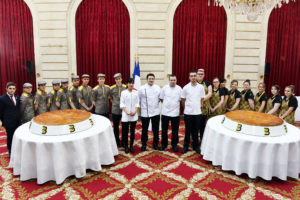 Avant de déguster les deux immenses galettes des rois confectionnées par Joël Picquenard, boulanger à Vaucresson, le Président de la CNBPF a porté devant Emmanuel Macron les demandes de la Profession. Dominique Anract a souligné que la baguette est l’un des symboles du savoir-faire et de l’excellence française, justifiant une distinction à la mesure de son rayonnement : l’inscription de la baguette de tradition française au Patrimoine Culturel Immatériel de l’Unesco. « Pour obtenir cette reconnaissance, Monsieur le Président, les boulangers de France auront besoin de votre soutien » a-t-il insisté auprès d’Emmanuel Macron. De même, le Président de la CNBPF a sollicité le soutien du Président de la République pour développer l’apprentissage et souligné la nécessité de mieux encadrer l’urbanisme commercial pour stopper la désertification des centres villes. Enfin Dominique Anract a insisté sur notre métier de tradition qui, tout en assurant la promesse du « fait maison », la sécurité alimentaire et l’intérêt général, n’en continue pas moins de se moderniser, concluant « il le fera d’autant plus si les contraintes qui pèsent sur son statut d’entreprise artisanale se simplifient, tant au plan juridique que social et fiscal ». Prenant ensuite la parole, Emmanuel Macron s’est déclaré favorable à toutes ces demandes, avant de prendre la pose avec les jeunes lauréats de nos concours professionnels.