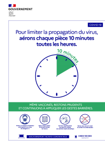 • Aération-ventilation : Laissez les portes et/ou fenêtres ouvertes en permanence ou au minimum 5 minutes toutes les heures afin que l’air se renouvelle régulièrement. A défaut, utiliser un système de ventilation mécanique. Si possible, procéder à une mesure du dioxyde de carbone dans l’air à des endroits et périodes de forte fréquentation.