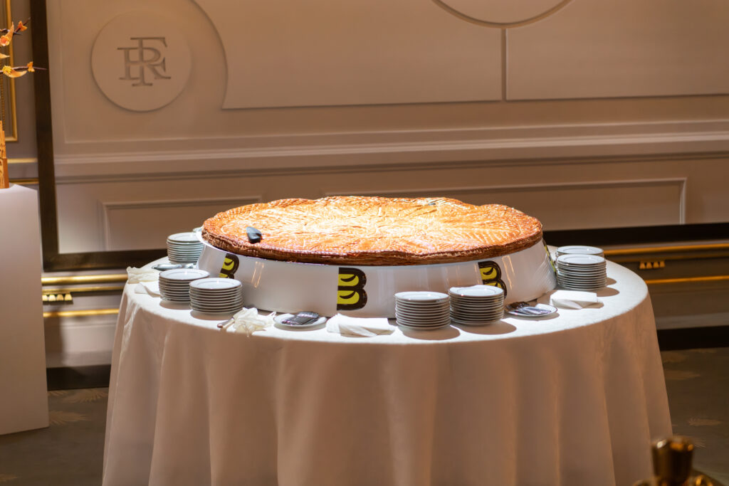 La galette, cette année a été réalisée par l’Equipe de France de Boulangerie – Son Président Sylvain Herviaux, avec Rodolph Couston MOF et Thierry Meunier) et le décor est un clin d’œil aux artisans tout corps d’état qui ont su rendre sa superbe à Notre Dame de Paris. Je salue Michel Picon et Joel Fourny.